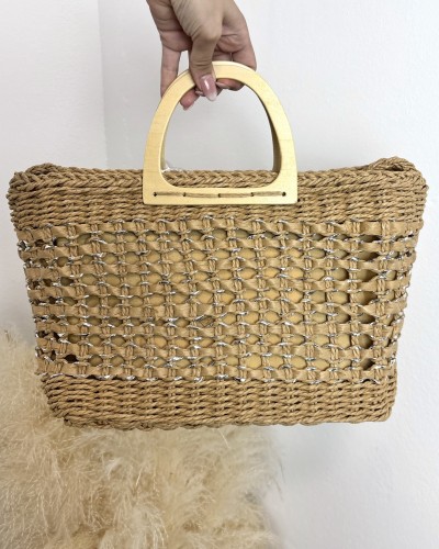 Bolso de tejido de paja en tono camel con detalles plateados y asa de madera. Natural, elegante y con un brillo sutil que eleva cualquier look de verano.